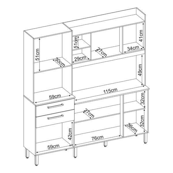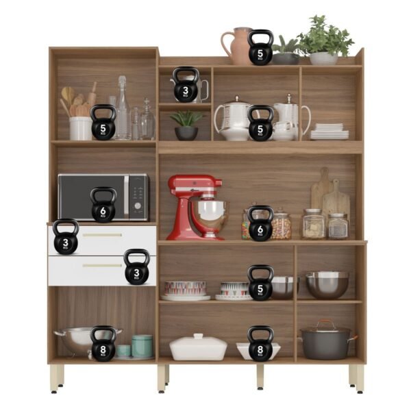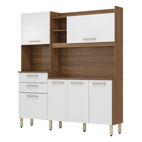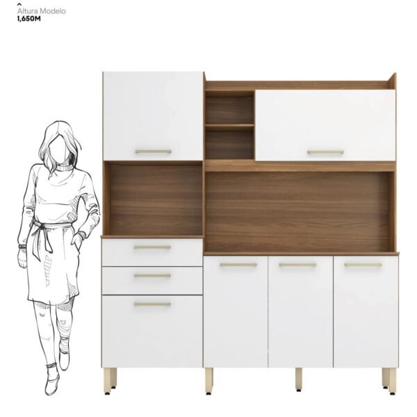 Cozinha compacta com 6 portas, sendo uma superior com pistão a gás e duas amplas gavetas com corrediça metálica, 3 prateleiras internas e ainda possui pés reguláveis. Com este armário a sua cozinha vai ficar mais linda e aconchegante.