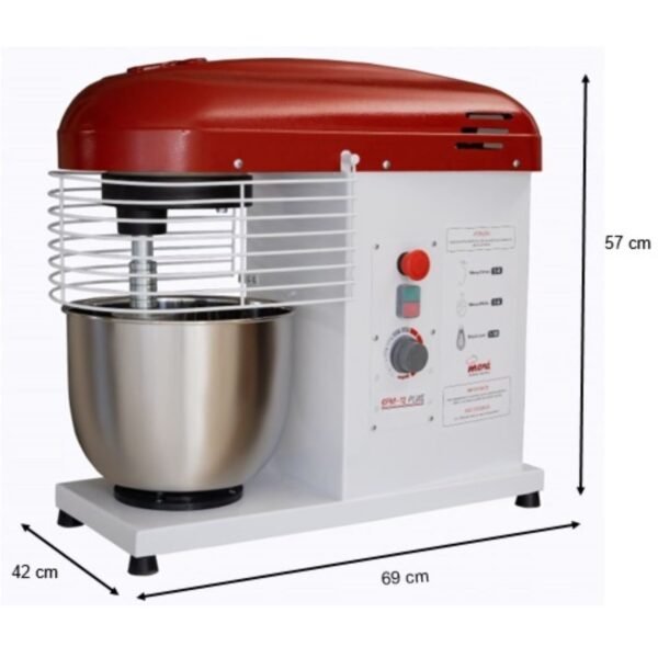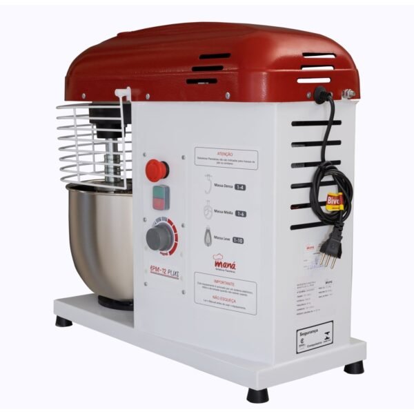 BPM-12 PLUS Batedeira Planetaria Maná 12 litros Plus As linha de batedeiras plus da Maná é a melhor escolha para ser utilizada confeitarias, padarias e demais negócios que demandem produções intermitentes. São ideais para produção de massas de consistência leve, cremosas, similares a panquecas, sorvetes, cremes, biscoitos, bolos, pré-misturas, claras em neve, chantilly, marshmallows, glacês, etc. Não são indicadas para massas pesadas de pão, sonho, pastéis e similares – Acompanha batedor espiral, batedor raquete, batedor globo. – Potência 1000w – Bivolt – Troca de velocidade eletrônica, com 10 níveis de variação. – Possiu sistema de proteção térmico que evita a queima do equipamento por sobrecarga ou aquecimento excessivo, garantindo muito mais durabilidade. – Corpo robusto em aço carbono com pintura epoxi. – Cuba em aço inoxidável – Tampa em poliuretano termoformado. – Pés emborrachados e reguláveis. – Possui sistema de segurança NR-12. – Dimensões: altura 57cm, comprimento 69cm e largura 42 cm. – Peso: 21,2kg