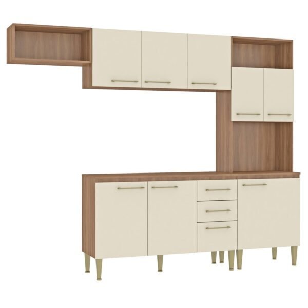 A Fellicci Móveis orgulhosamente apresenta com exclusividade para você a Nova Cozinha Malu, composta por 9 portas e 02 gavetas. Produzido com MDP 12mm com portas 15mm de excelente qualidade, possui dobradiças e corrediças metálicas. A cor da madeira é super e elegante, combinando perfeitamente com pés e puxadores na cor bronze. Os pés de 17cm de altura possuem regulagem de altura. Possui um ótimo aproveitamento de espaço interno e externamente conta com nichos superiores para colocação de utilidades e itens decorativos. O paneleiro possui espaço de 57,6 x 50,0 x 38,5cm para forno. Leve para sua casa esse excelente produto e tenha garantia de satisfação!