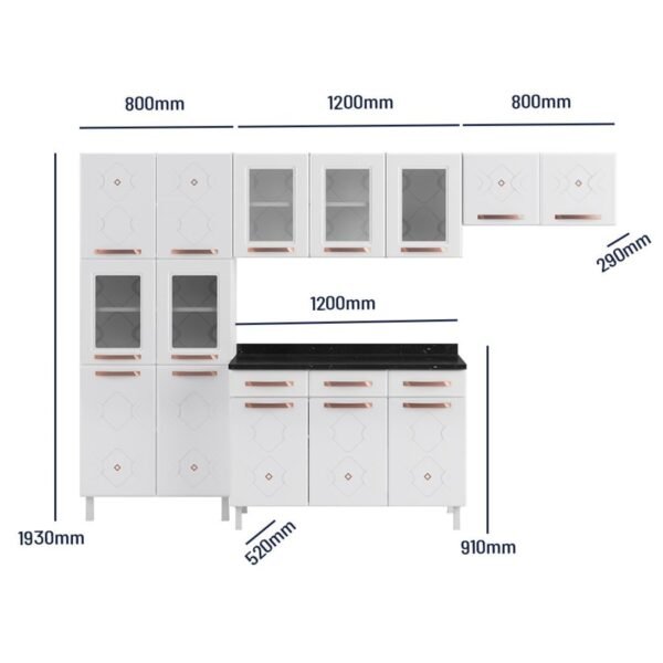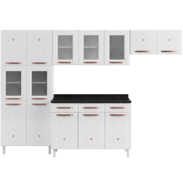 Uma cozinha como a Mirage New torna único qualquer ambiente. Ela possui 05 vidros que, além de serem temperados garantindo total segurança, ainda são serigrafados com design harmônico. Os puxadores e apliques resinados na cor Cobre Fosco agregam beleza e sofisticação para essa cozinha. Composta por quatro modulações (paneleiro duplo, armário triplo, armário duplo baixo e balcão triplo), tem espaço disponível de sobra para armazenar utensílios e alimentos de maneira organizada e funcional. Fabricada em aço, recebe pintura eletrostática e anticorrosiva que garante resistência e durabilidade ao móvel. A Cozinha Mirage New é a opção perfeita para quem busca beleza e qualidade em um único produto. Cores: Podem variar de acordo com o monitor, a iluminação do ambiente ou sua percepção visual.
