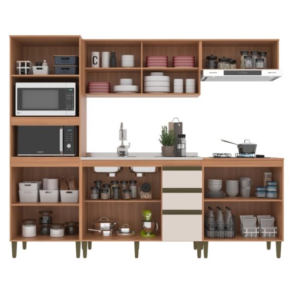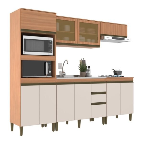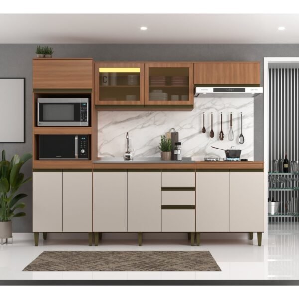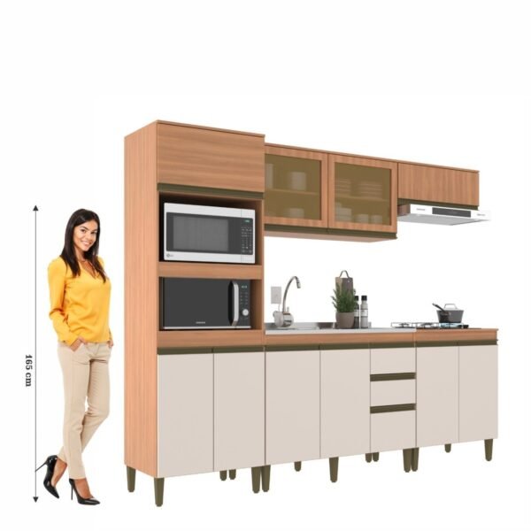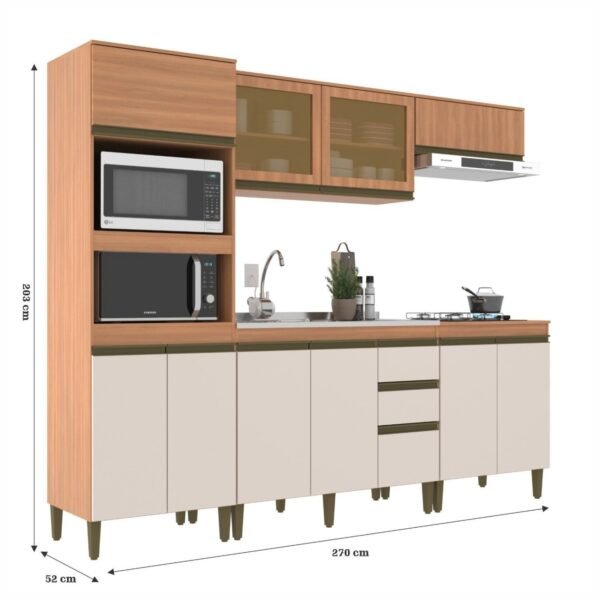 Nossa Cozinha Cecilia foi elaborada para deixar seu ambiente de cozinha ainda mais gostoso. Composta por 10 portas sendo 8 de bater e 2 de bascular. Suas medidas são 203 cm de altura 270 cm de comprimento e 52 cm de profundidade. Possui 5 prateleiras internas com espaço que você vai adorar. Sua torre quente possui espaça para micro-ondas e forno com as suas medidas A:41,5 XL 67 X P: 52 para o micro e forno A: 38,8 X L: 67 X P: 52 cm, possui corrediças e dobradiças metálicas. Pés com regulagem de altura.