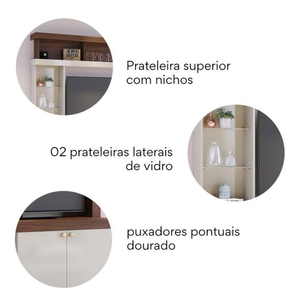 A estante Valença, com seu design tradicional, foi feita para valorizar ainda mais sua sala. A bancada, que suporta TVs com pés de até 50 polegadas, possui 3 nichos e 2 compartimentos fechados para você organizar seus objetos, aparelhos eletrônicos e até subwoofer. Há ainda nichos na parte superior e uma torre lateral com 2 prateleiras de vidro que, além de trazer beleza ao produto, são ideais para você expor seus itens de decoração favoritos. Tudo isso em combinação de cores únicas que deixarão seu ambiente elegante, com qualidade Colibri Móveis. Características: – Dimensões: 160,3 cm (largura) x 188 cm (altura) x 37,8 cm (profundidade – Peso: 47,72 kg – Material: – Capacidade para TV de até 50 polegadas – Amplo espaço de armazenamento com um total de 8 nichos e 2 compartimentos fechados – Necessita montagem (acompanha manual e kit ferragens) – Garantia: 03 meses.