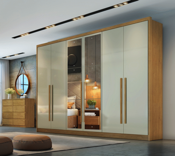 100% MDF, KIT ESPELHO PARAFUSADO, PUXADORES COM ACABAMENTO AMADEIRADO, COLUNADO EM 25MM, INTERNO ELE E ELA, GAVETAS INTERNAS COM PUXADORES, ESPAÇO PARA LONGO, DOBRADIÇA DE PRESSÃO DE 35MM, CORREDIÇAS TELESCÓPICAS, CABIDEIROS E CALCEIRO EM ALUMÍNIO.!