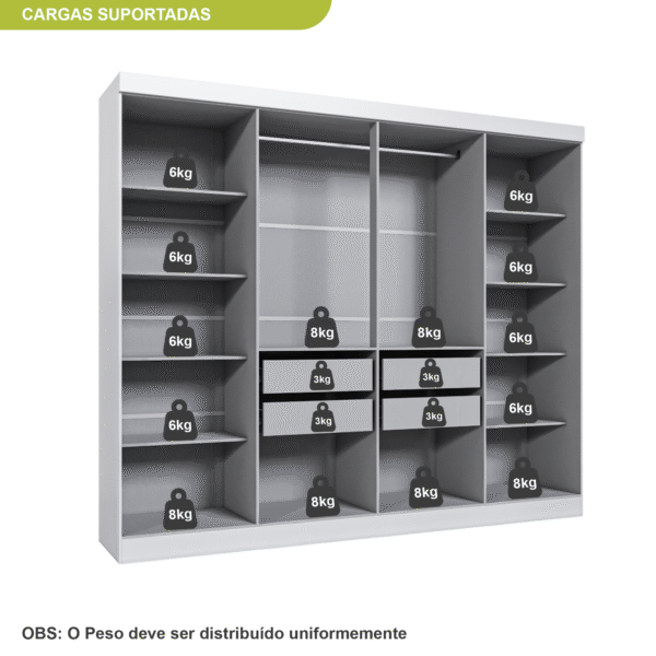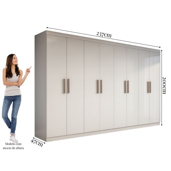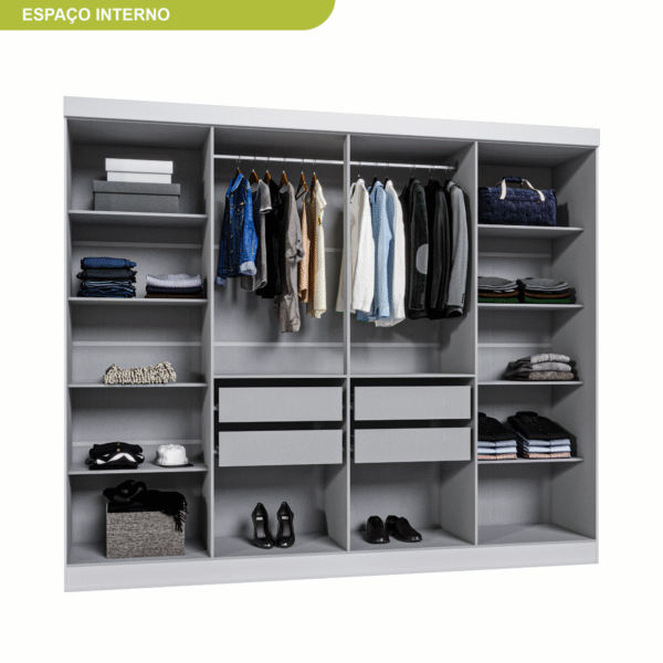 Durabilidade é a palavra para o guarda roupa Paris 8 portas, desenvolvido em material ecologicamente correto, o produto possui 8 portas de abrir com um amplo espaço interno, gavetas internas com corrediças metálicas , varão e calceiro em madeira. Modulação interna versátil para roupas longas. O guarda roupa Paris 8 portas é ideal para quem procura espaço e versatilidade, tornado seu ambiente ainda mais moderno e aconchegante.