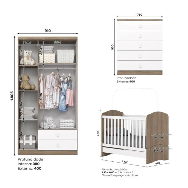 Esse lindo Conjunto de Quarto Infantil é tudo o que você pediu em um único ambiente. Toda essa combinação foi pensada para que este conjunto permaneça em sua casa por muitos anos acompanhando o crescimento de seus pequenos. O Roupeiro Faz de Conta possui 3 portas e 2 Gavetas externas com corrediças metálicas que permite um deslize mais seguro e suave, produzido em MDP e pintura UV, interno no padrão Trama, que imita tecido, proporcionando mais aconchego ao ambiente. Excelente divisão interna, com cabideiro resistente para melhor organização das roupas, puxadores em ABS.  O Roupeiro Bala de Menta é flex, com dupla opção de cor, podendo ser todo Branco ou Branco/Rosa-chá, ele é perfeito para tornar o ambiente do seu filho ainda mais lindo e aconchegante. A Cômoda Faz de Conta possui 05 gavetas com corrediças metálicas, que permite um deslize mais seguro e suave, amplo espaço para acomodar as roupas e objetos do bebê. Produzido em MDP e pintura UV, que protege o móvel e assegura sua qualidade e resistência. Compacta, pode ser utilizada tanto em ambientes pequenos quanto em amplos. O Berço Mini Cama traz todo o conforto e a segurança que seu bebê precisa para dormir tranquilo. Produzido em MDP, a sustentação possui revestimento interno e externo com pintura UV, esse revestimento assegura durabilidade ao móvel. Além de suas funcionalidades como, estrado com regulagem de altura, mosquiteiro, o berço se transforma em Sofá-cama e Mini-cama. Desta forma você possui 3 móveis em 1 e acompanha todas as fases do seu filho. Ideal para colchão de 0,60cm. A segurança também é outro destaque, pois está certificado e aprovado pelo Inmetro.
