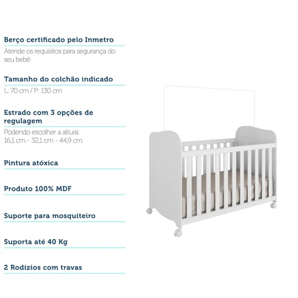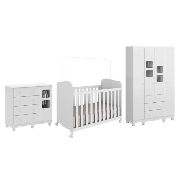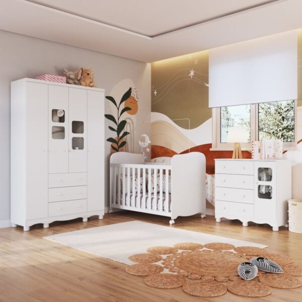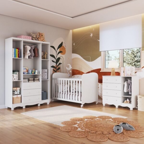 “Um ambiente aconchegante, prático e funcional para o bebê. A resposta para sua busca!<br/>Todos os móveis produzidos em 100% MDF com acabamento em Pintura UV Atóxica para maior segurança de toda a família. As gavetas possuem corrediças metálicas telescópicas que proporcionam mais facilidade ao abrir e fechar. Com cabideiros metálicos e prateleiras, valorizando o espaço interno. Acompanha 2 rodapés (1 usinado e um reto), possibilitando a escolha no momento da montagem. O berço Uli possui um design clássico e elegante com grades fixas e estrutura resistente, garantindo a durabilidade. Além disso, possui certificado do Inmetro, três regulagens de altura no estrado e acompanha suporte para mosquiteiro.”!