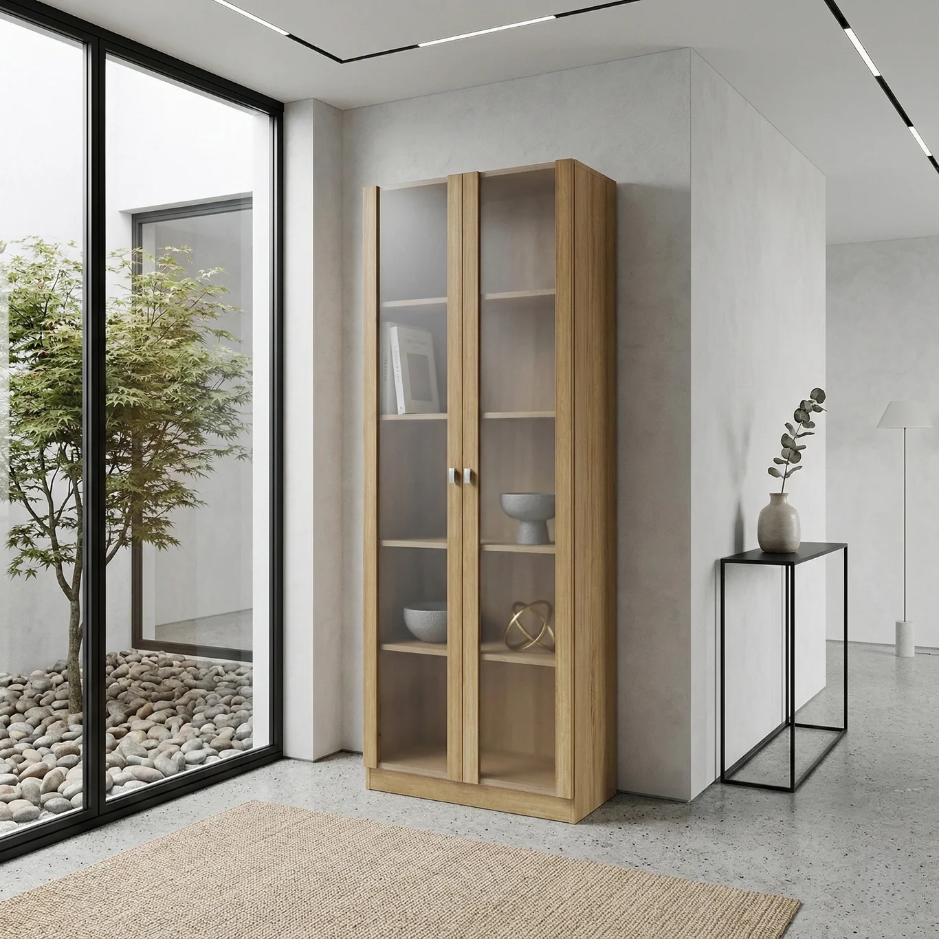 Esse Armário Multiuso alto é ideal para acomodar objetos ao seu estilo, pois possui 2 portas de vidro para melhor conservação dos produtos no seu interior, além disso, tem 4 prateleiras internas espaçosas e resistentes. O design é arrojado e diferenciado, você conseguirá acomodar os objetos ao seu gosto e dar um toque especial no visual da decoração no seu ambiente.