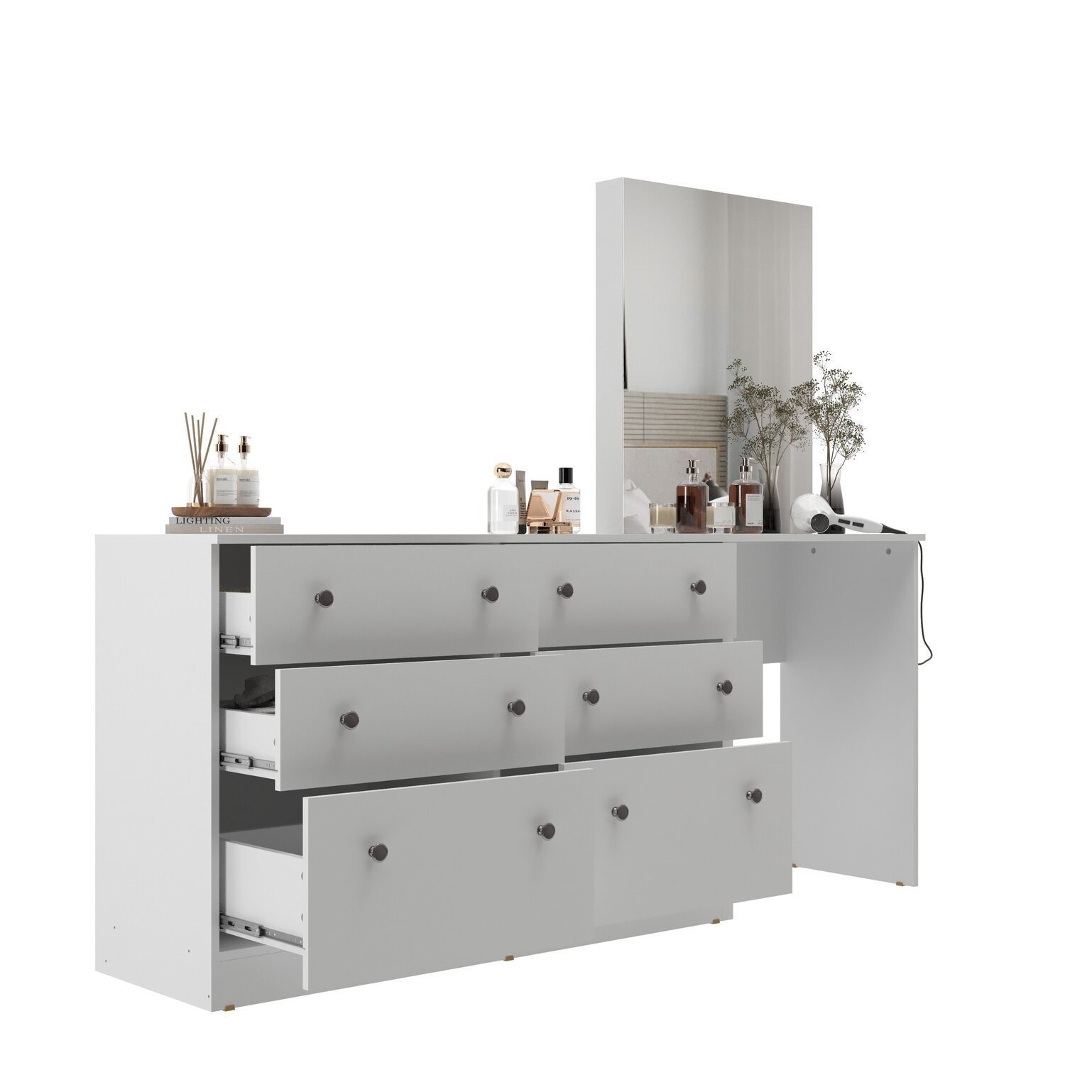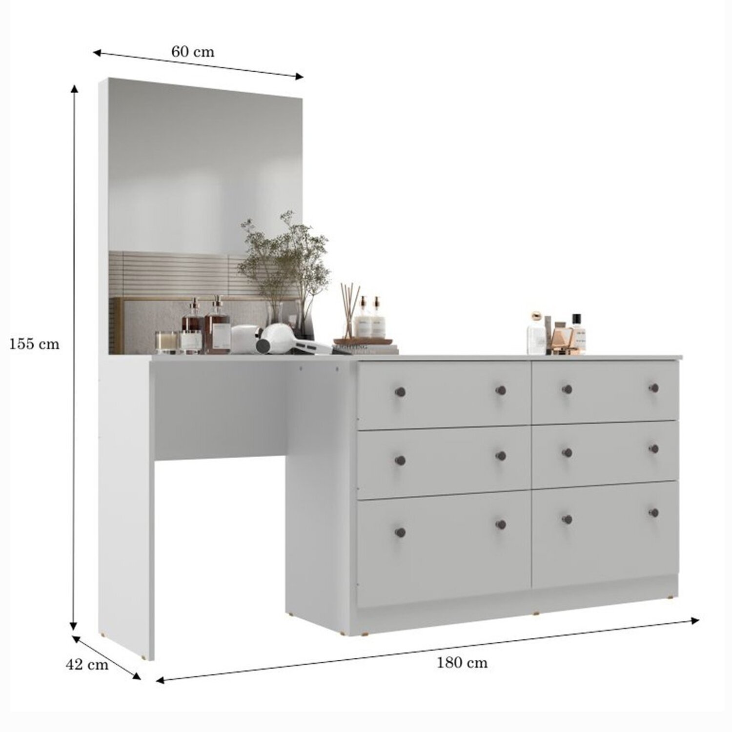 A Cômoda Penteadeira 6 Gavetas e Espelho é a solução perfeita para quem busca praticidade, organização e elegância em um único móvel. Com um design moderno e funcional, esta cômoda é ideal para otimizar o espaço do seu quarto ou closet, proporcionando um ambiente mais harmonioso e bem organizado. Com 6 gavetas equipadas com Trilho Telescópico , você terá um amplo espaço para armazenar roupas, acessórios e objetos pessoais de forma organizada. Sendo que 2 são gavetões onde a profundidade é maior , ideal para guardar Objetos maiores como por exemplo secador de Cabelo . Além da cômoda, conta também com a Penteadeira que da um toque mais sofisticado ao ambiente , otimizando espaço é perfeito para criar um cantinho da beleza único e cheio de charme.