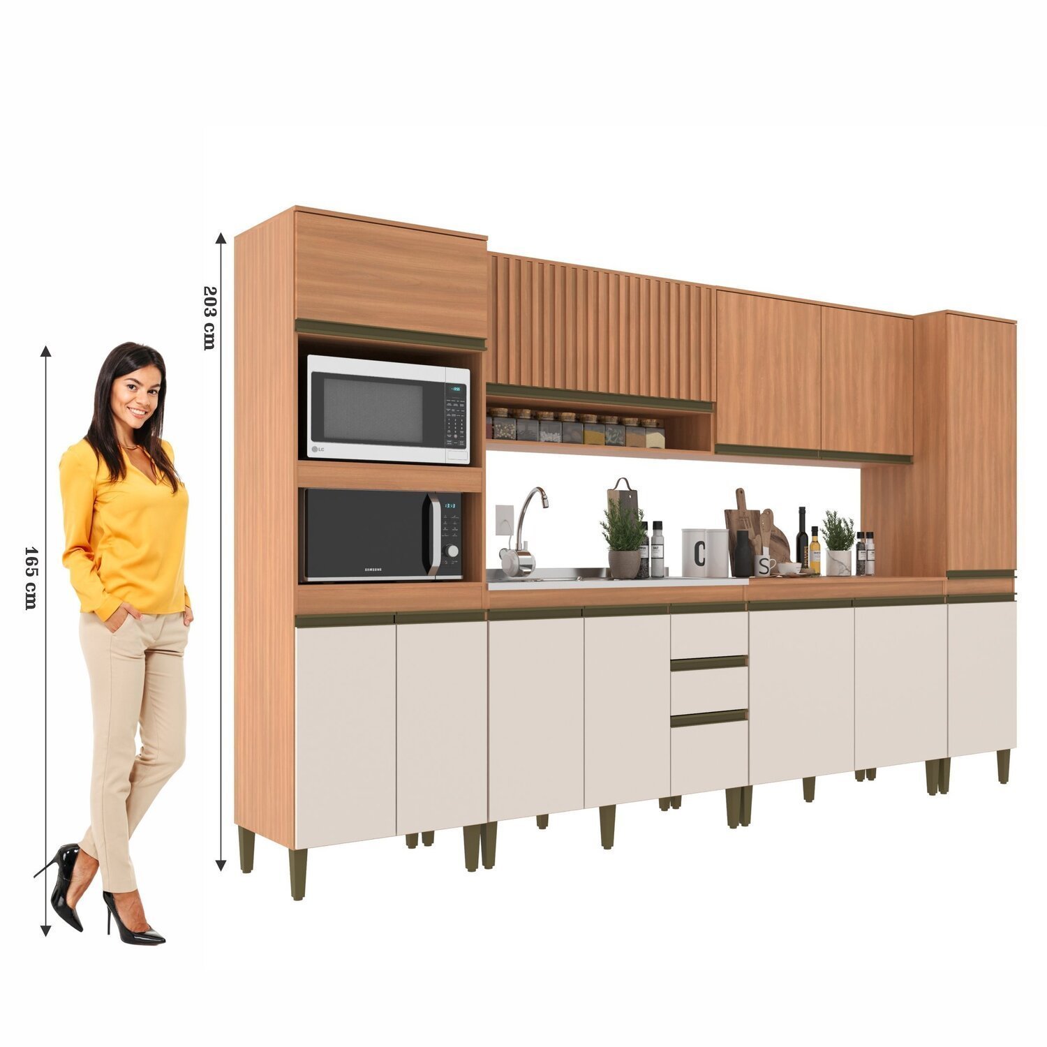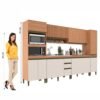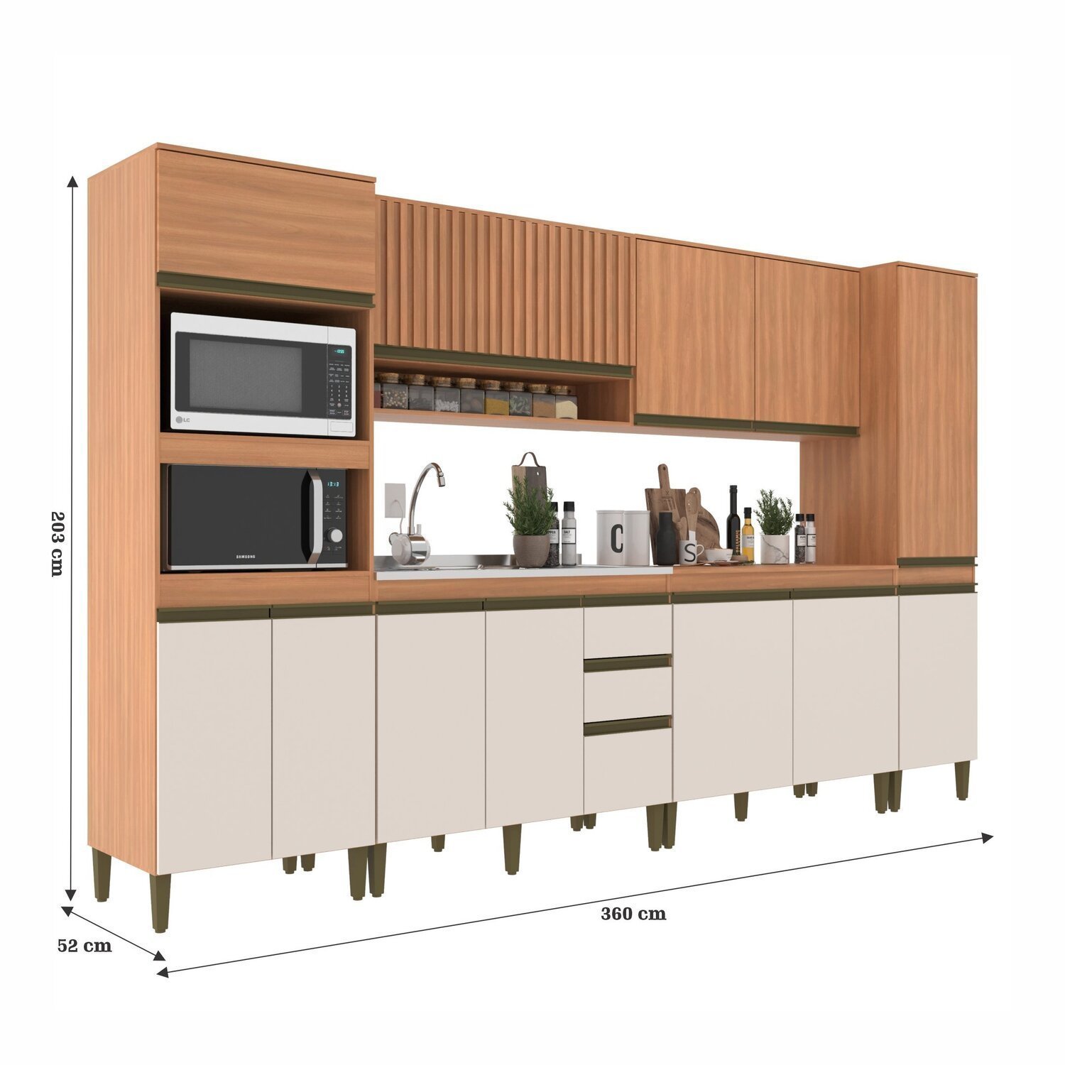 A Cozinha Modulada Cecília seis peças possui torre quente com espaço para micro-ondas e forno com as suas medidas A:41,5 XL 67 X P: 52 para o micro e forno A: 38,8 X L: 67 X P: 52 cm, possui corrediças telescópicas e dobradiças metálicas. Contém um armário ripado 120 cm de comprimento, paneleiro contendo 50 cm de comprimento, balcão com tampo 120 cm e aéreo duas portas 120 cm. Produto fabricado com chapa de 1,5cm perfect. Medida total do produto 203 cm de altura 360 cm de largura e 52 cm de profundidade.