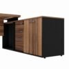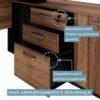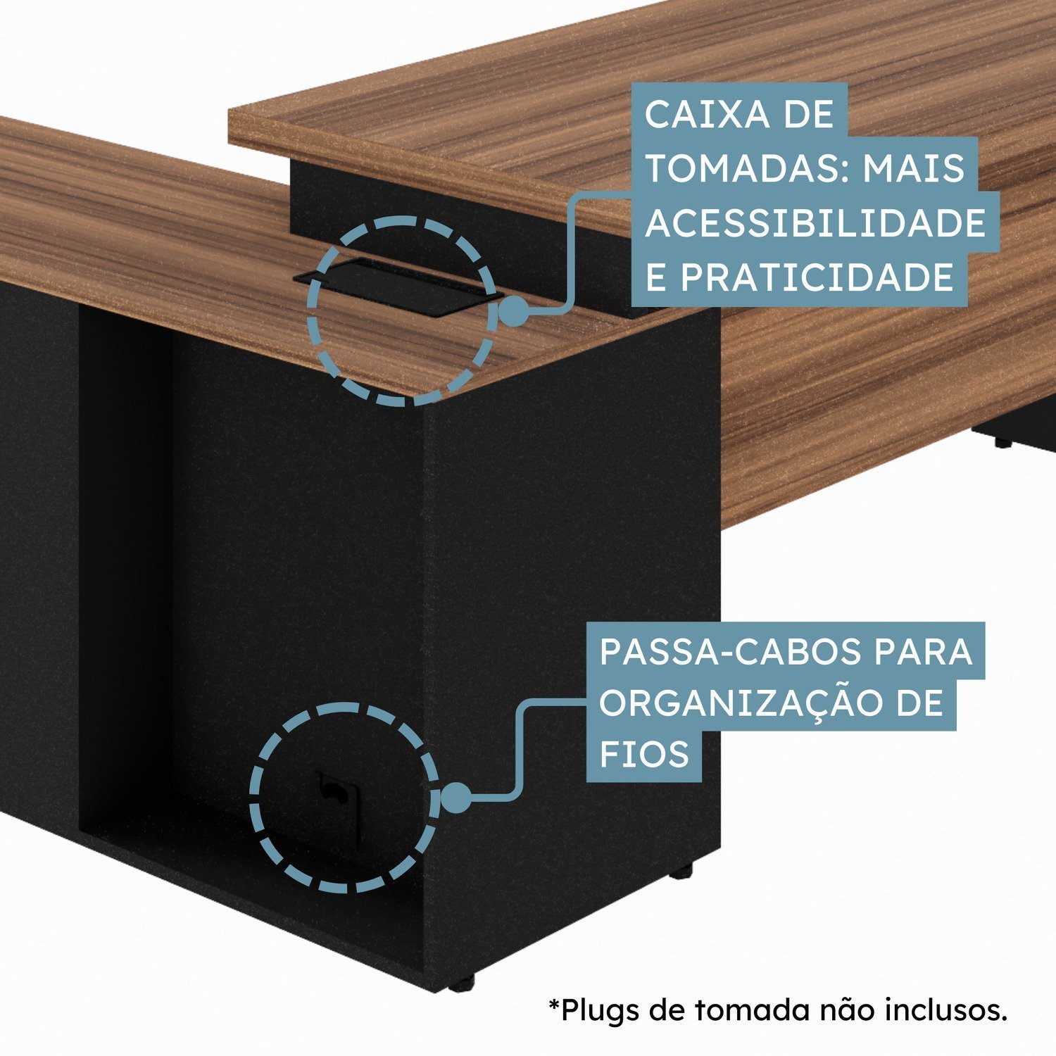Mesa Diretor dinâmica com armário lateral com caixa de tomadas: Tampo confeccionado em chapa de média densidade MDP (Médium Density Particleboard) com partículas selecionadas de madeira de reflorestamento, aglutinadas e consolidadas com resina sintética e termo estabilizadas sob pressão, com 40mm de espessura, revestido em ambas as faces com filme termo prensado melamínico, com espessura mínima de 0,2mm (BP). O mesmo é produzido com sistema de engrossuramento com pinos em aço zincado 35 mm (compr.) x 1 mm (esp.) para fixação das travessas. O tampo é encabeçamento em todos os topos com fita borda PVC (Polyvinyl chloride) 1 mm, colada a quente pelo sistema hotmelt CQ-645PUR que é elaborado a base de poliuretano reativo (PUR). A largura de cada lado da mesa é de 150cm. O lado com o tampo maior pode ser extendido até 180cm.