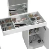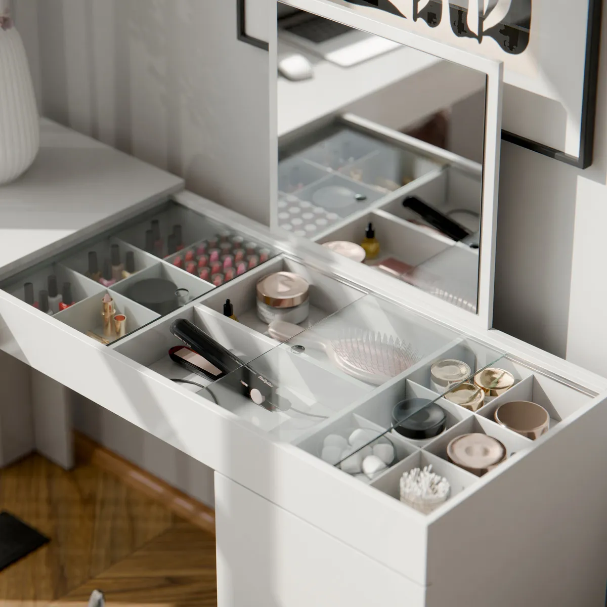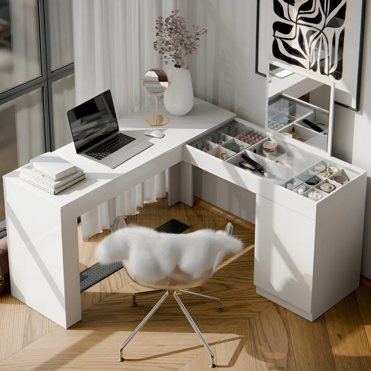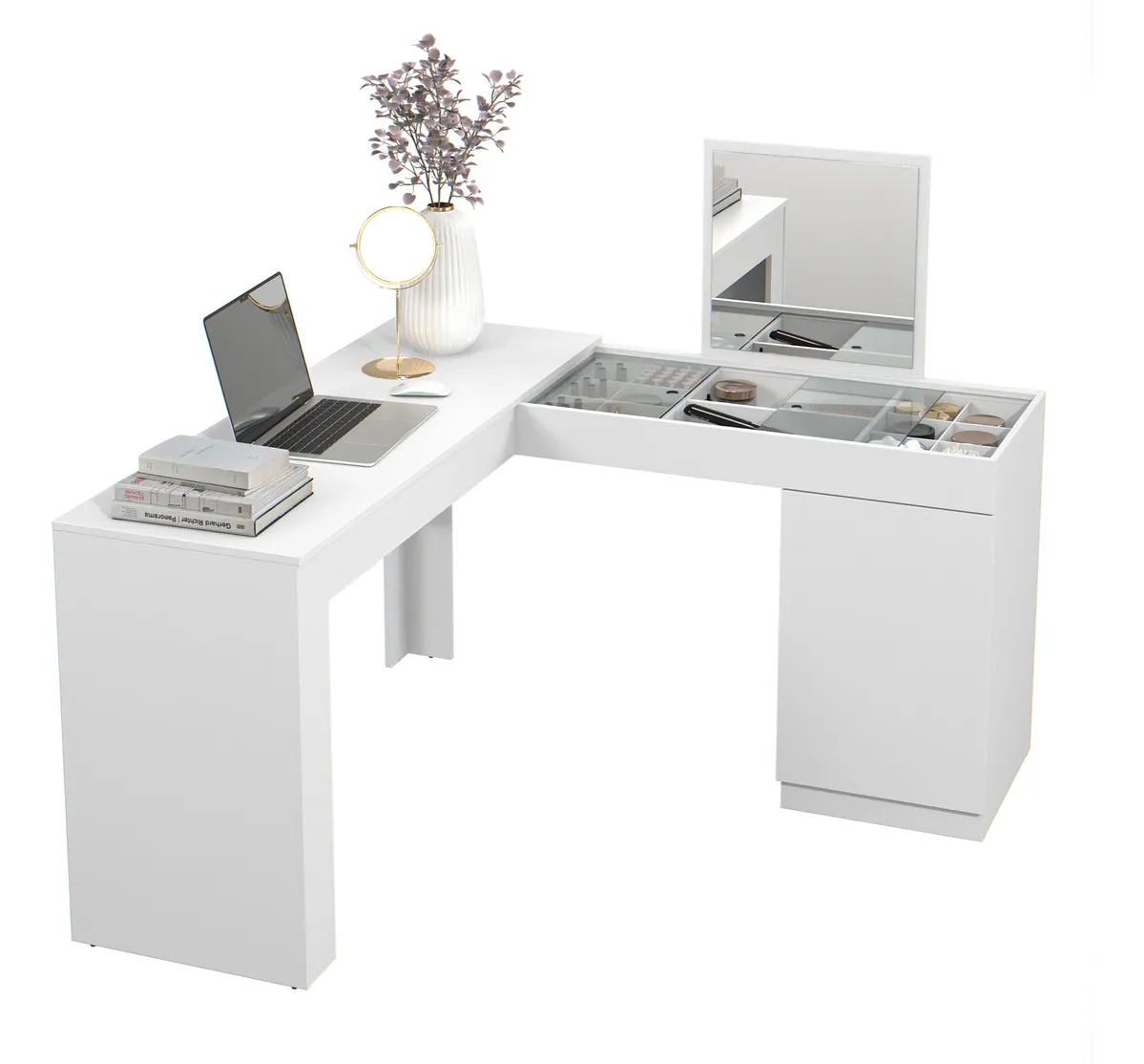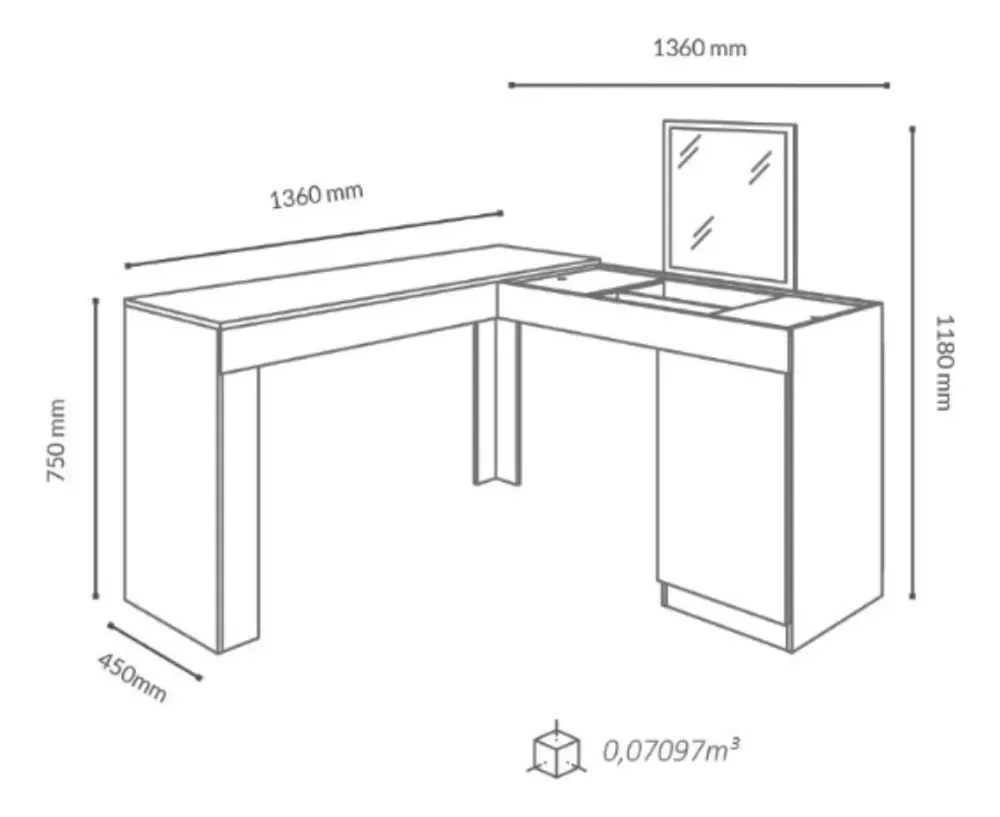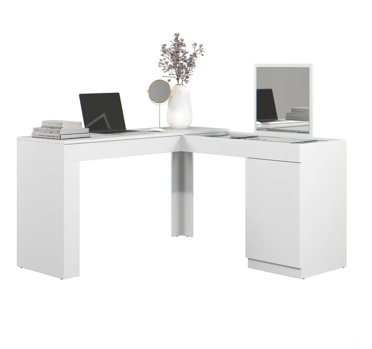 • Design Inteligente 2 em 1 Projetada para aproveitar perfeitamente os cantos do ambiente, esta mesa em formato “L” oferece uma superfície espaçosa. O grande diferencial é seu tampo com espelho, que se levanta para revelar um porta-objetos interno, ideal para guardar maquiagens, joias e acessórios, transformando-a instantaneamente em uma penteadeira funcional.
