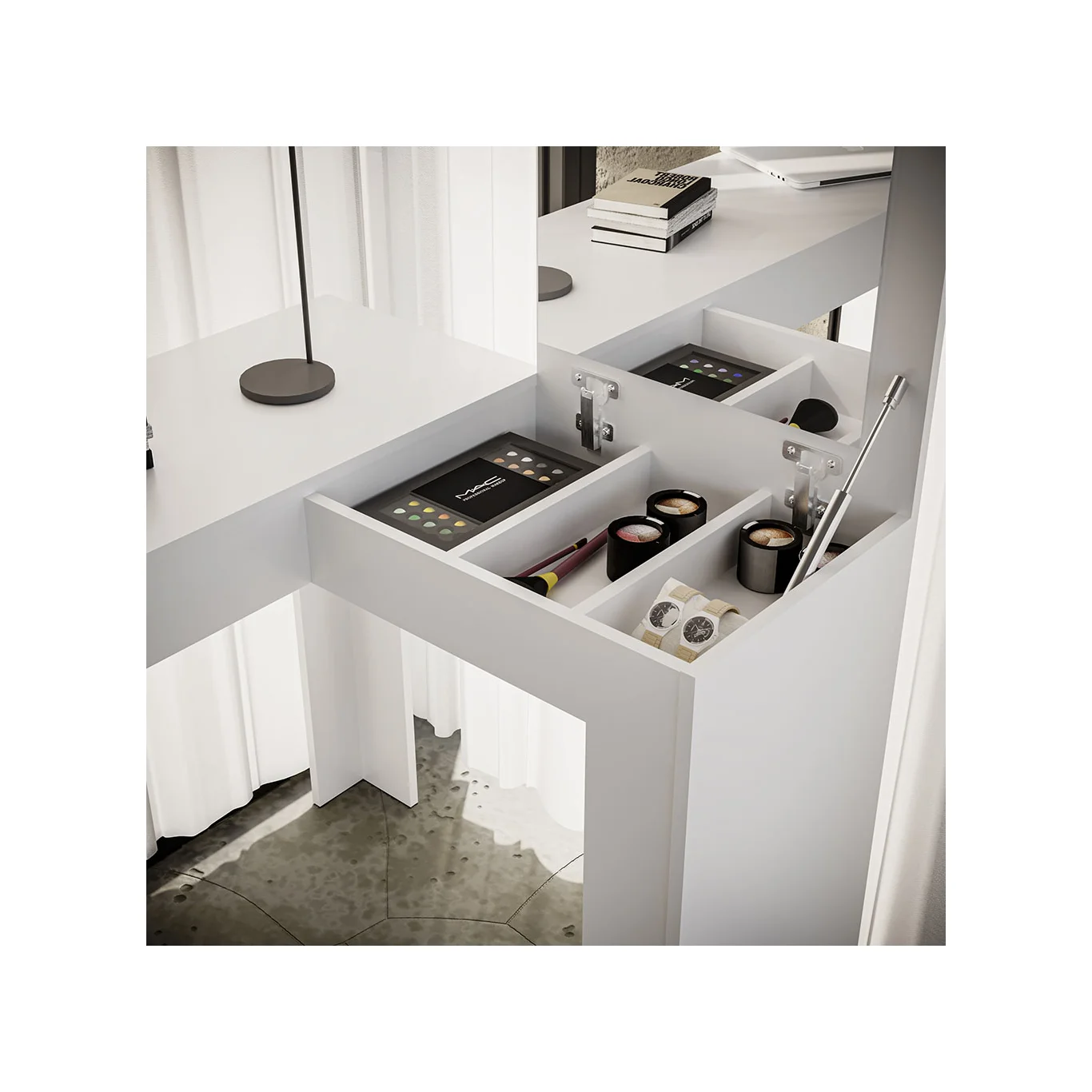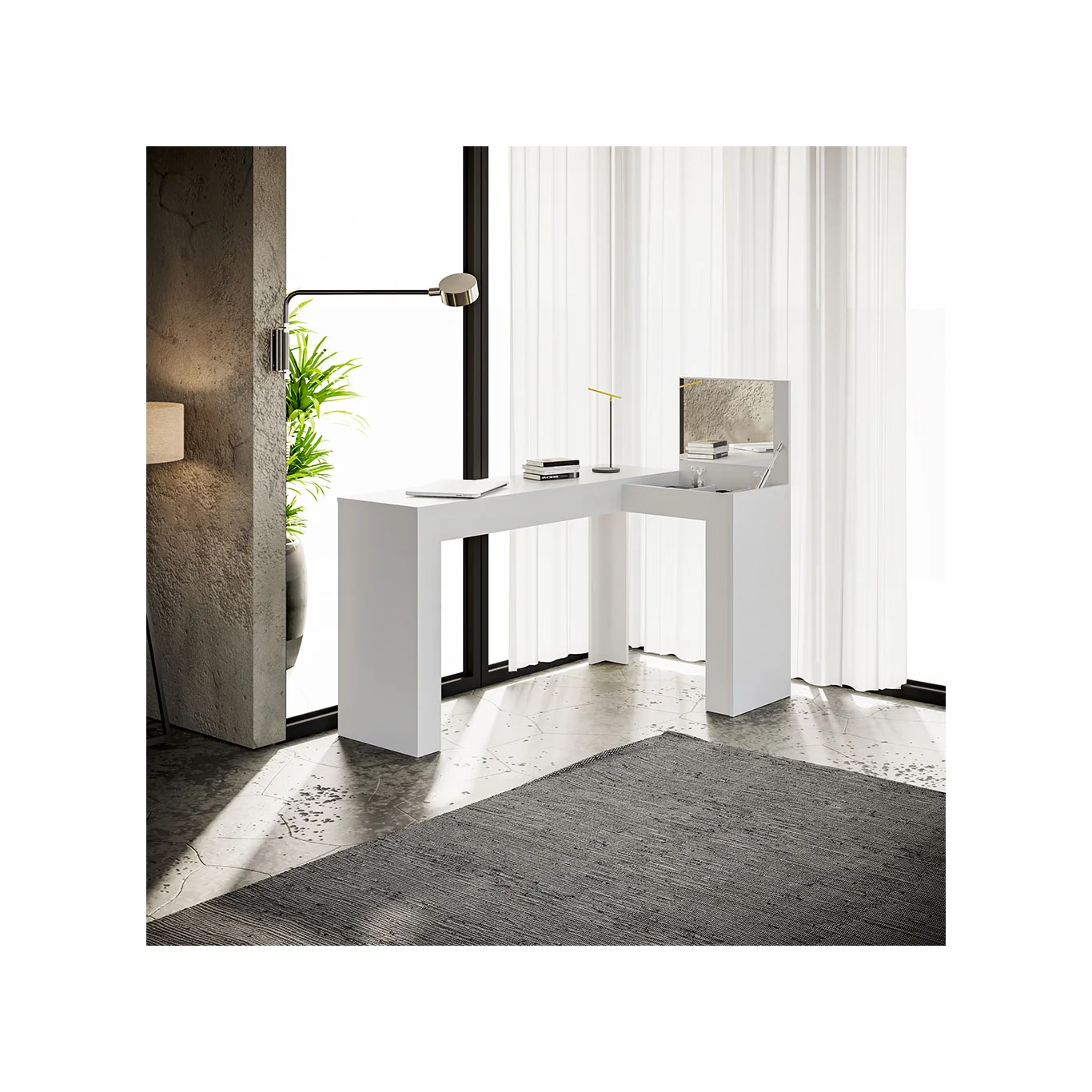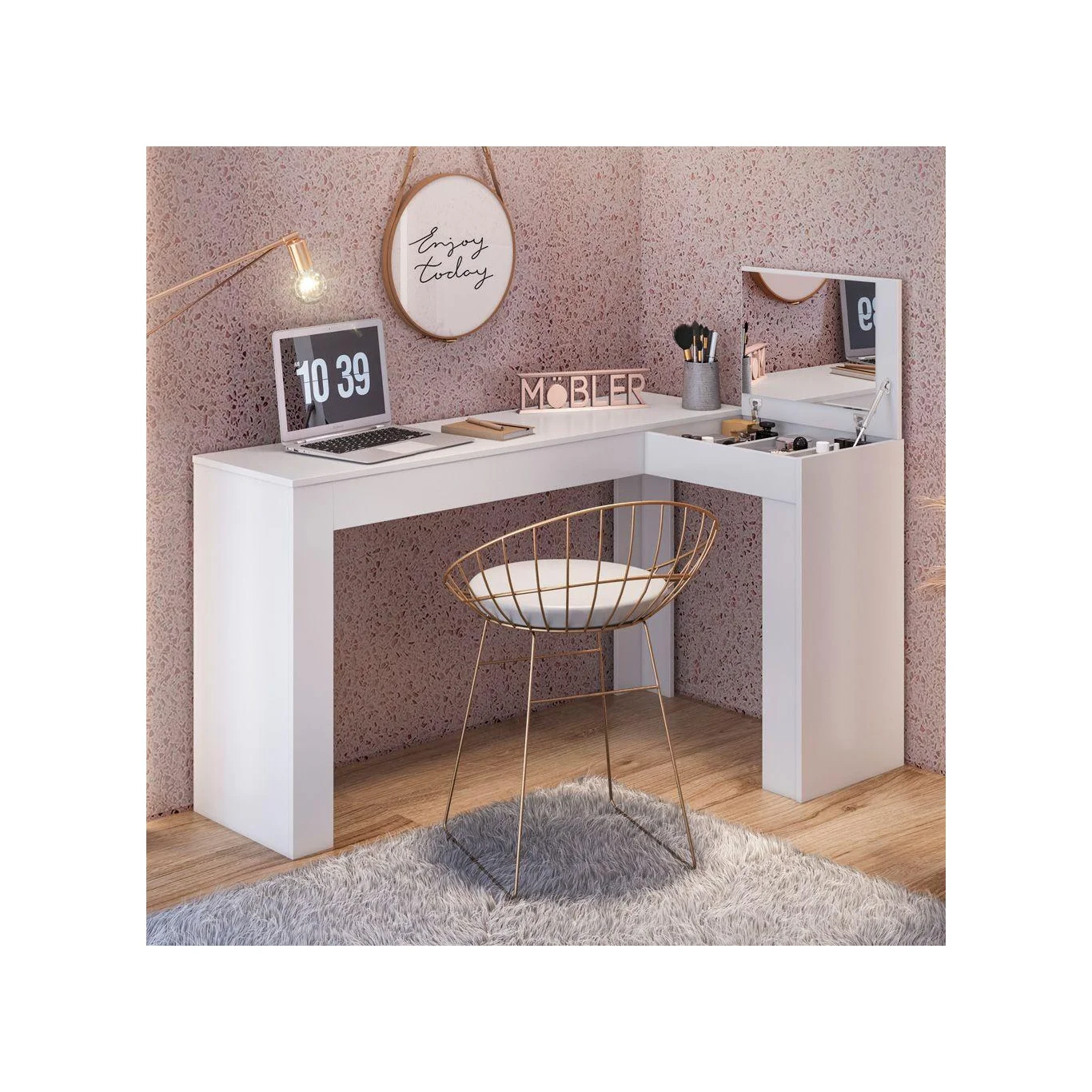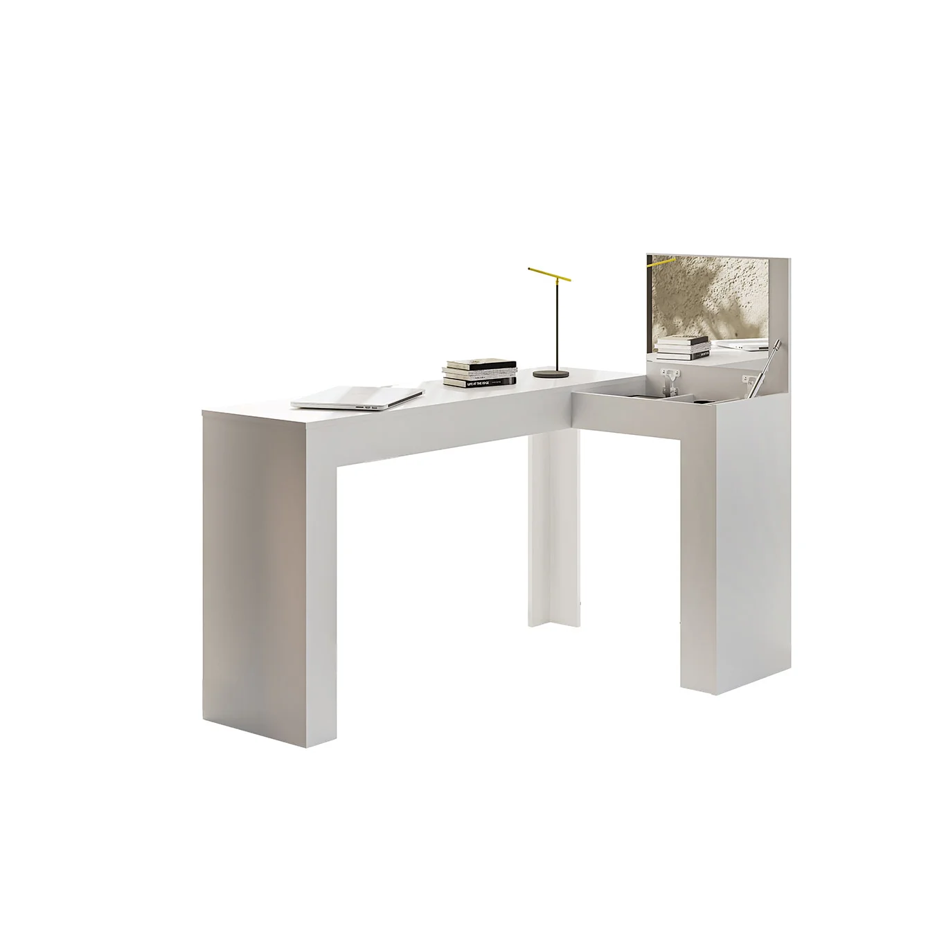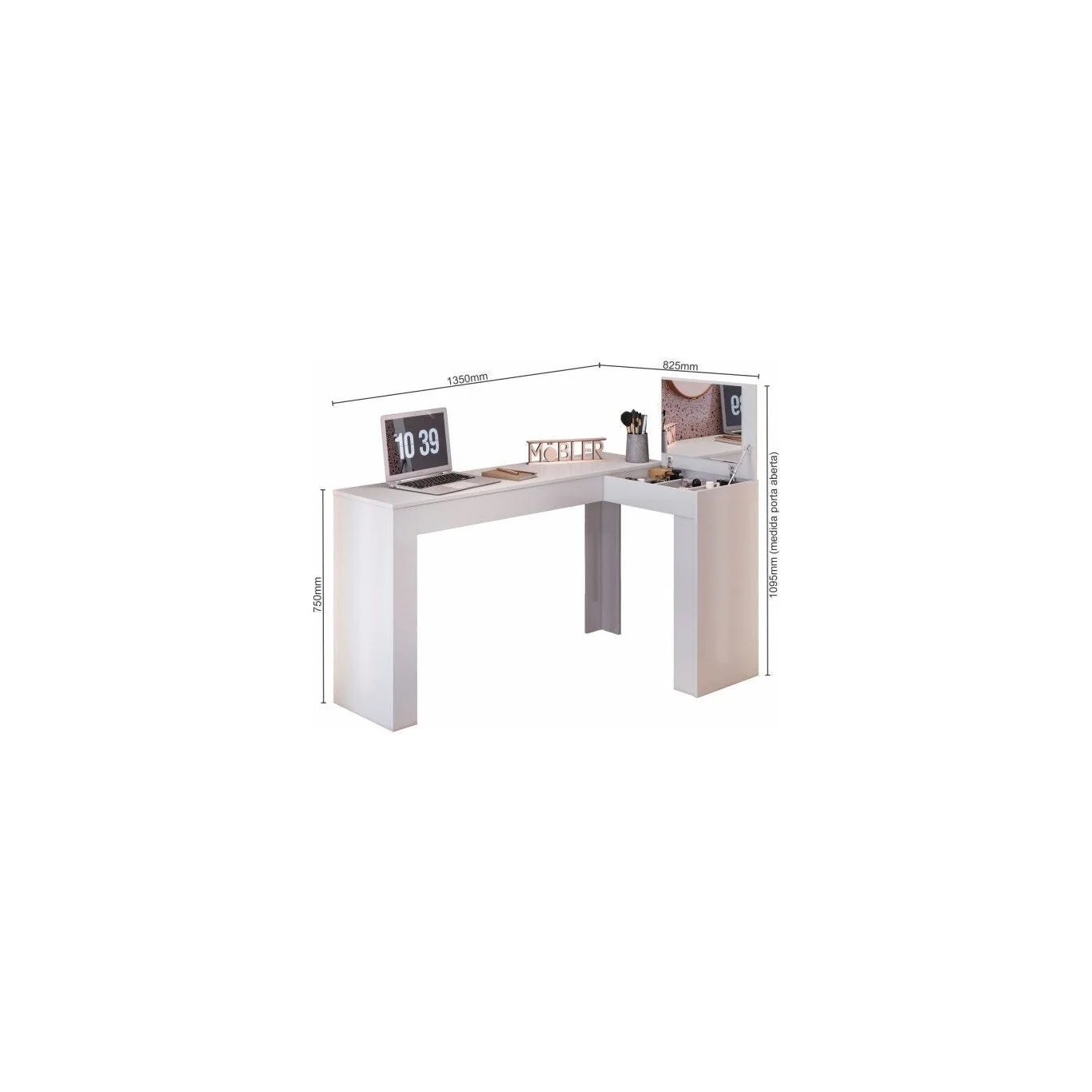 Escrivaninha com Camarim Jade, projetada para atender todas as suas necessidades, essa Escrivaninha conta com um tampo basculante e nichos organizadores para melhor organização de seus objetos. Perfeita para você que está em busca do diferente, funcional, esse produto com certeza deixará seu ambiente muito elegante. Este produto é configurado para ser montado para um único lado específico, ou seja, não possui montagem flex.