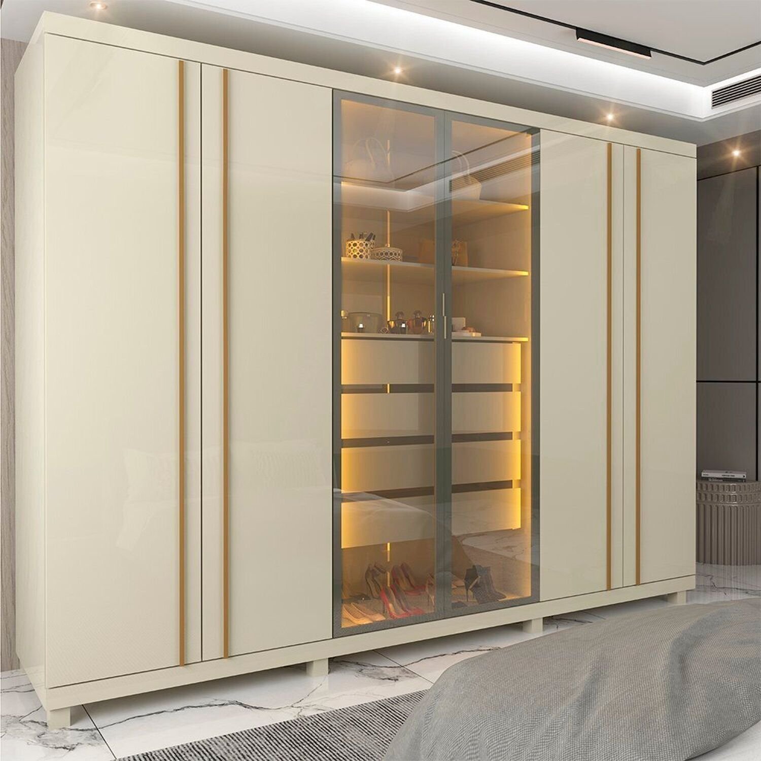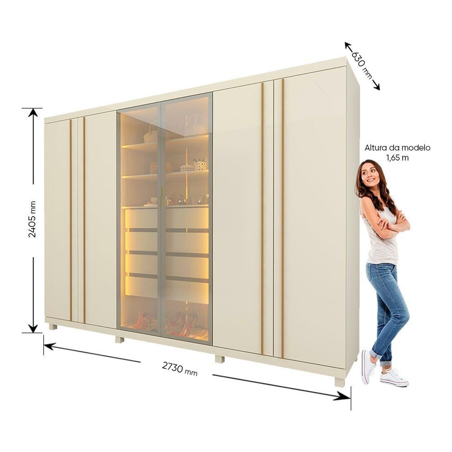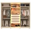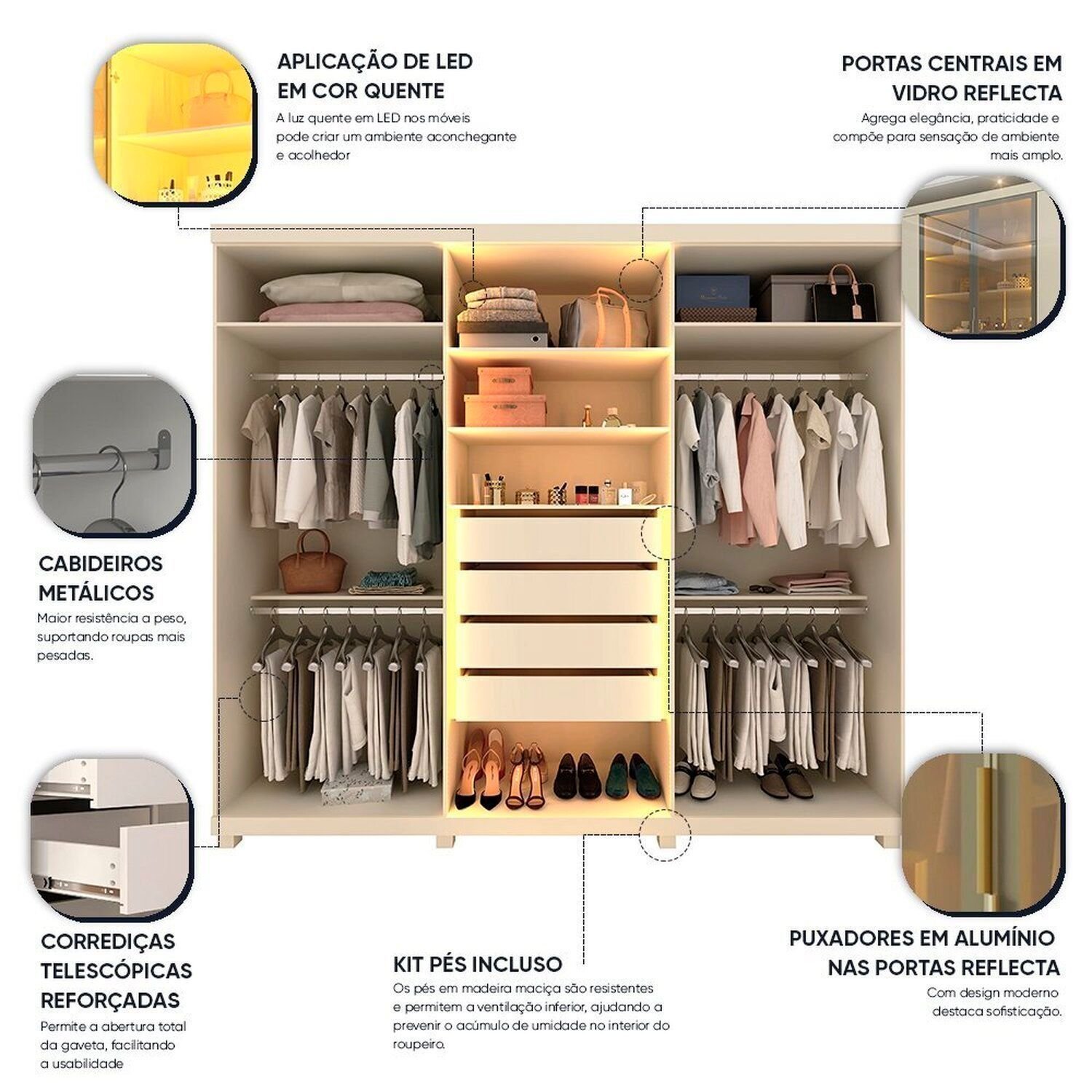 O Roupeiro Absolut Reflecta possui duas portas centrais em vidro reflecta, com molduras em alumínio e led vertical em cor quente em suas divisórias internas, é uma opção e funcional para sua casa. Com 63cm de profundidade, 4 gavetas espaçosas de corrediças telescópicas, sendo uma com divisórias porta joias, este móvel foi pensado para facilitar sua rotina e dar ponto de destaque na decoração e seu quarto.!